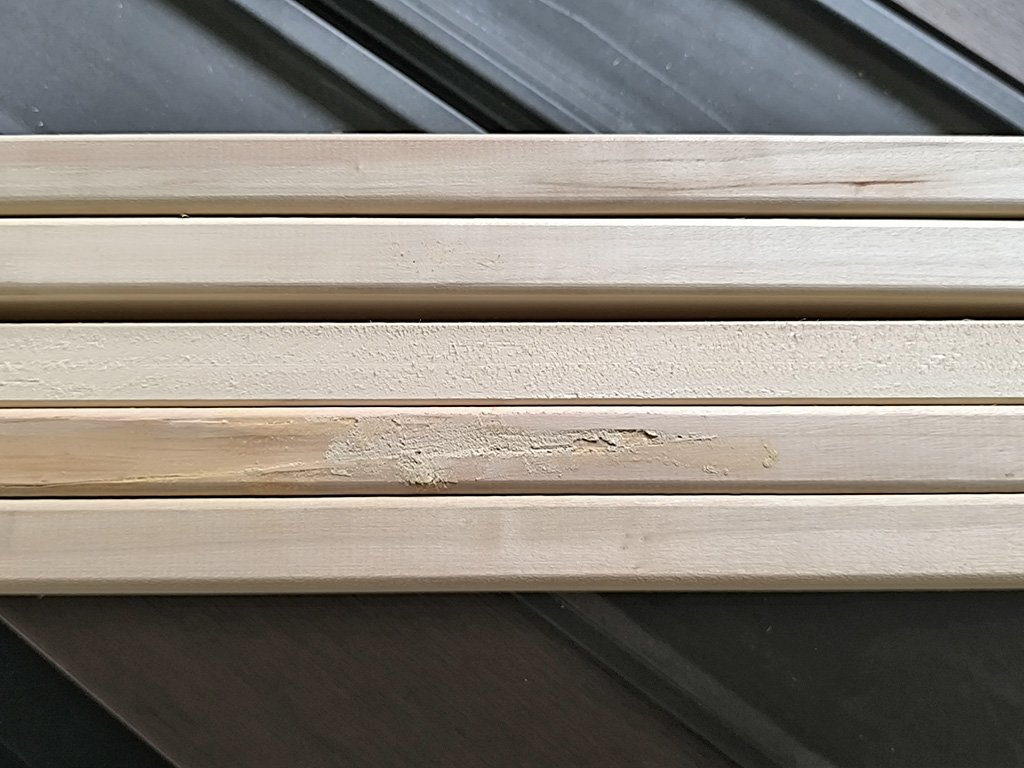 Lavičková prkna jsou zařazena do výprodeje z důvodu prohnutí, nedohoblování a poškození, může se objevit nezaoblená zrana (viz foto).