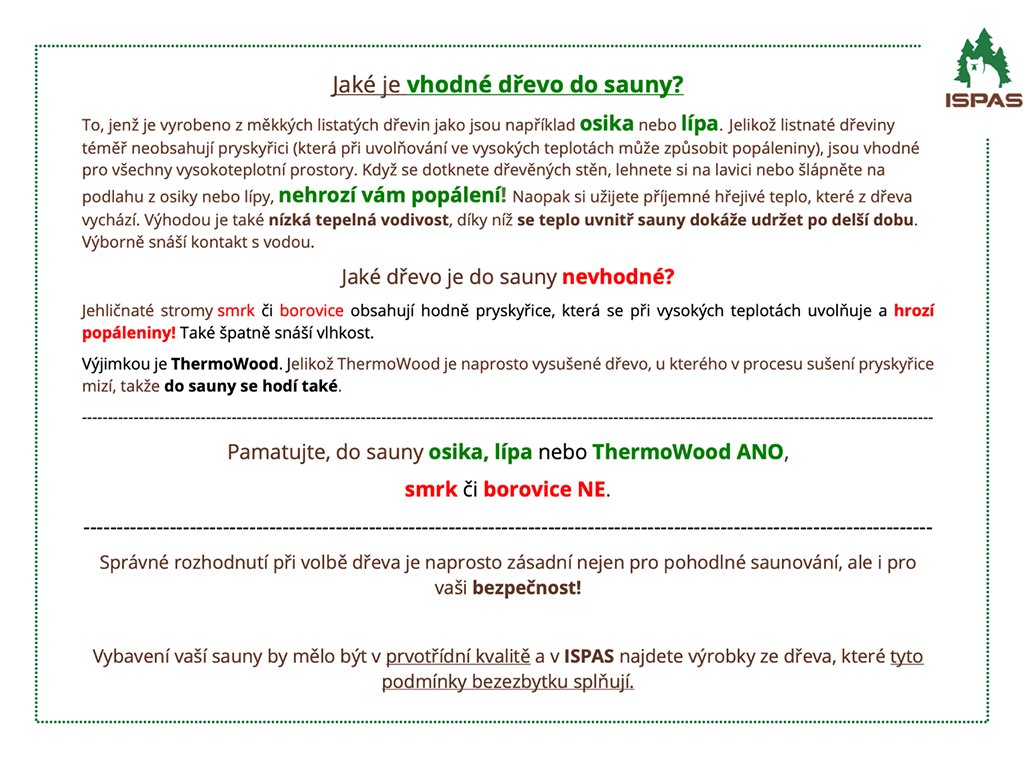Správné rozhodnutí při volbě dřeva je naprosto zásadní nejen pro pohodlné saunování, ale i pro vaši bezpečnost! Vybavení vaší sauny by mělo být v prvotřídní kvalitě a v ISPAS najdete výrobky ze dřeva, které tyto podmínky bezezbytku splňují.