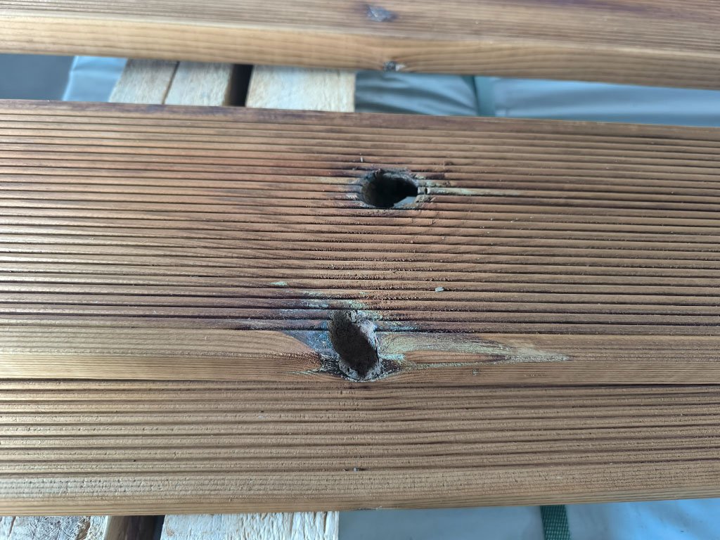 Terasová prkna jsou zařazeny do výprodeje z důvodu vypadlých suků, prasklin a poškození (viz foto).