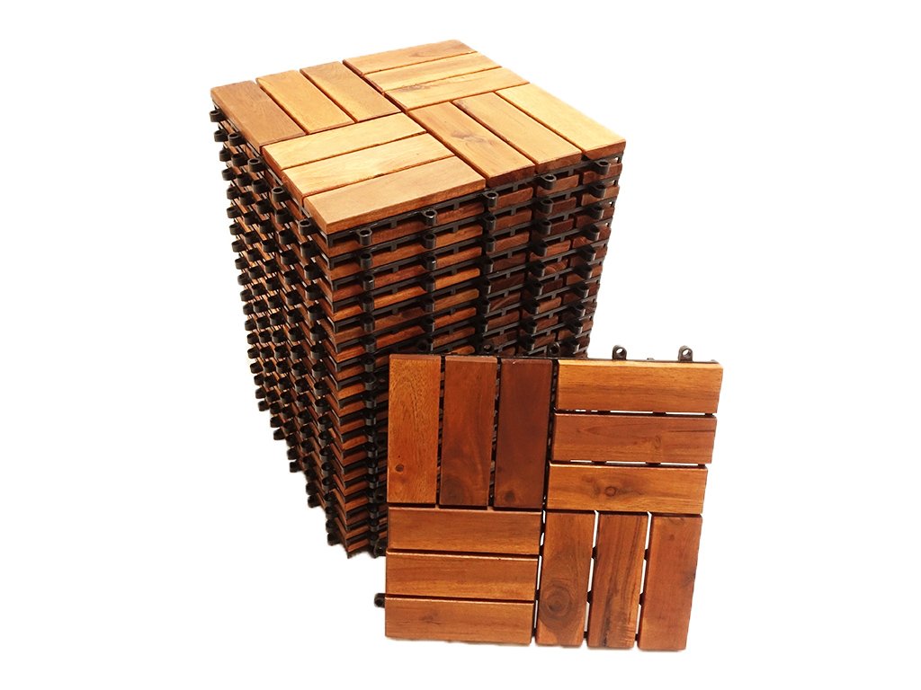 - Každá dlaždice se skládá z lamel (dřevěných prken nebo latí) z akátového dřeva, které jsou lepeny k nosné plastové základně s integrovaným zámkovým systémem.