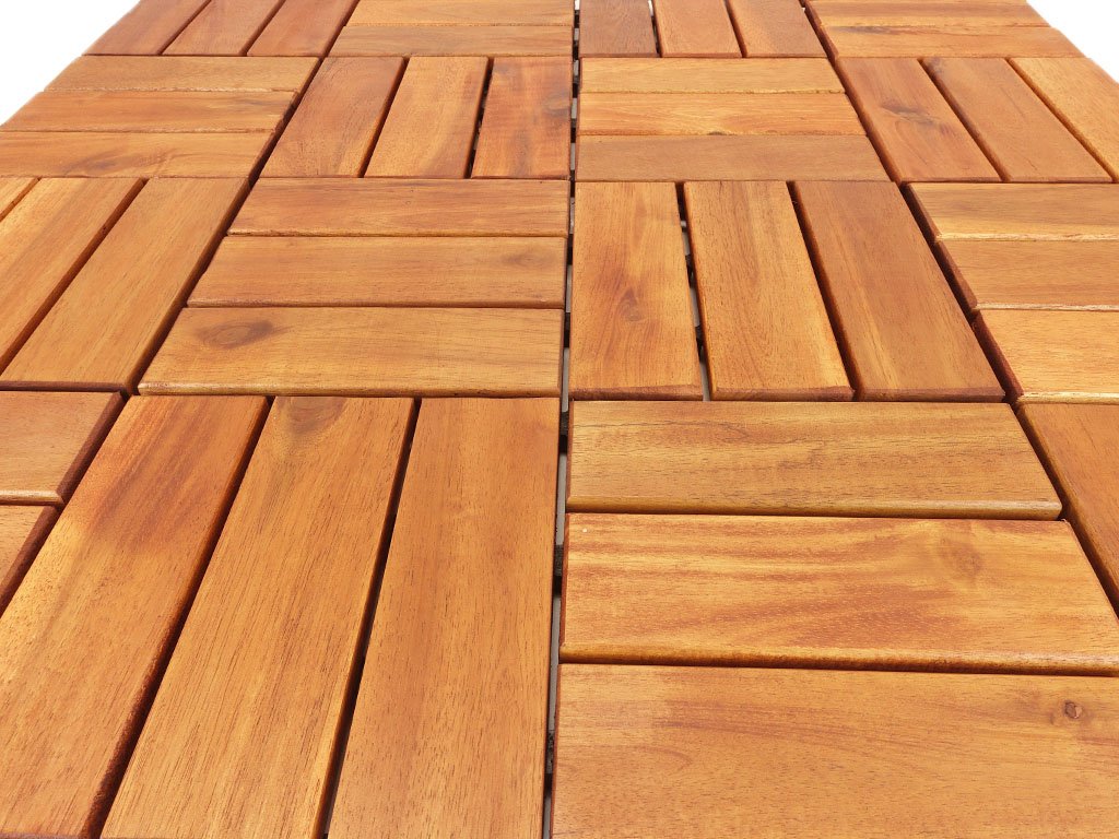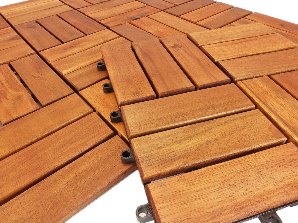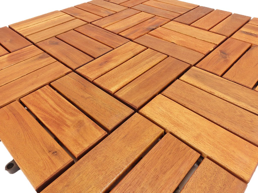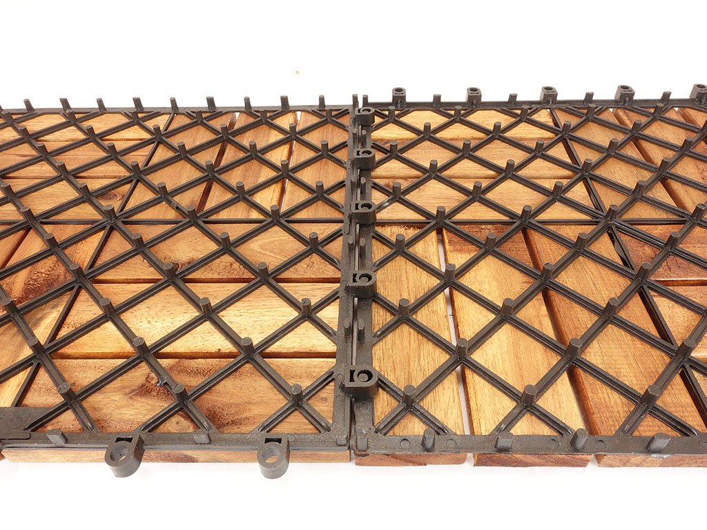 - Každá dlaždice se skládá z lamel (dřevěných prken nebo latí) z akátového dřeva, které jsou lepeny k nosné plastové základně s integrovaným zámkovým systémem.