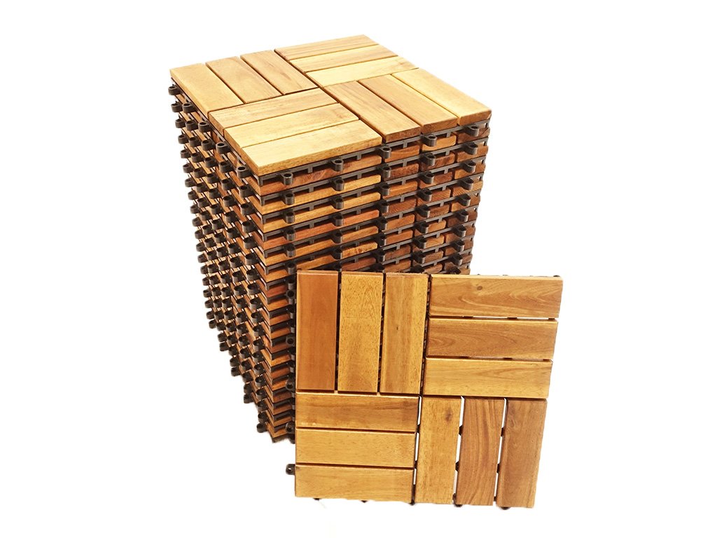 - Každá dlaždice se skládá z lamel (dřevěných prken nebo latí) z akátového dřeva, které jsou lepeny k nosné plastové základně s integrovaným zámkovým systémem.