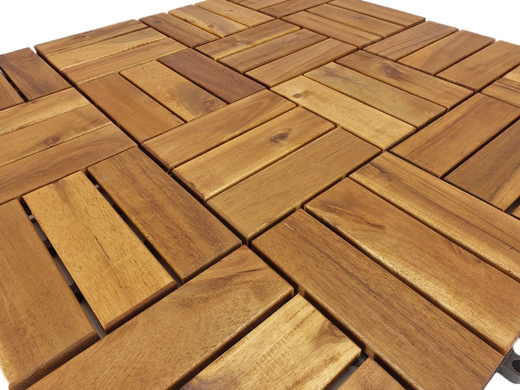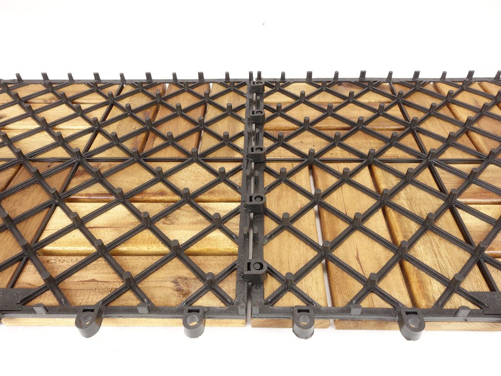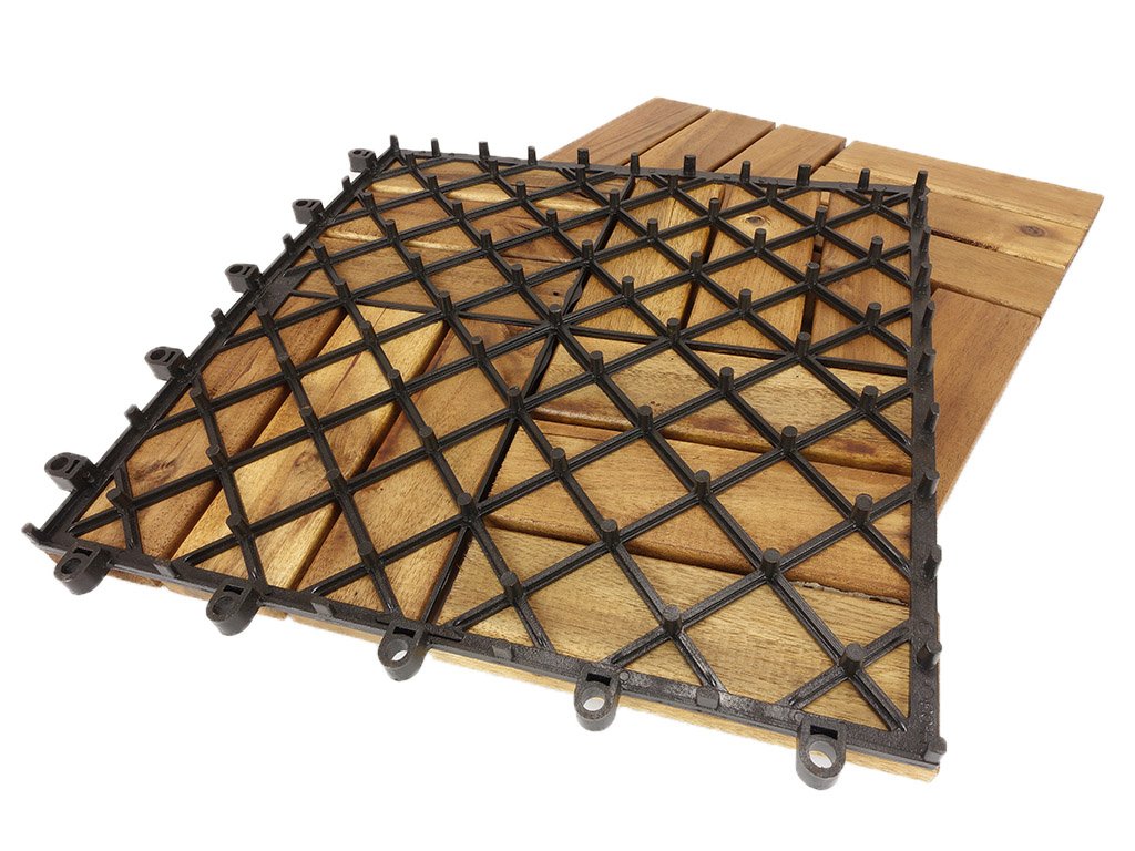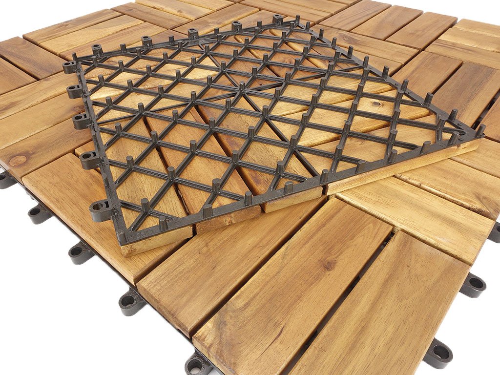 - Každá dlaždice se skládá z lamel (dřevěných prken nebo latí) z akátového dřeva, které jsou lepeny k nosné plastové základně s integrovaným zámkovým systémem.