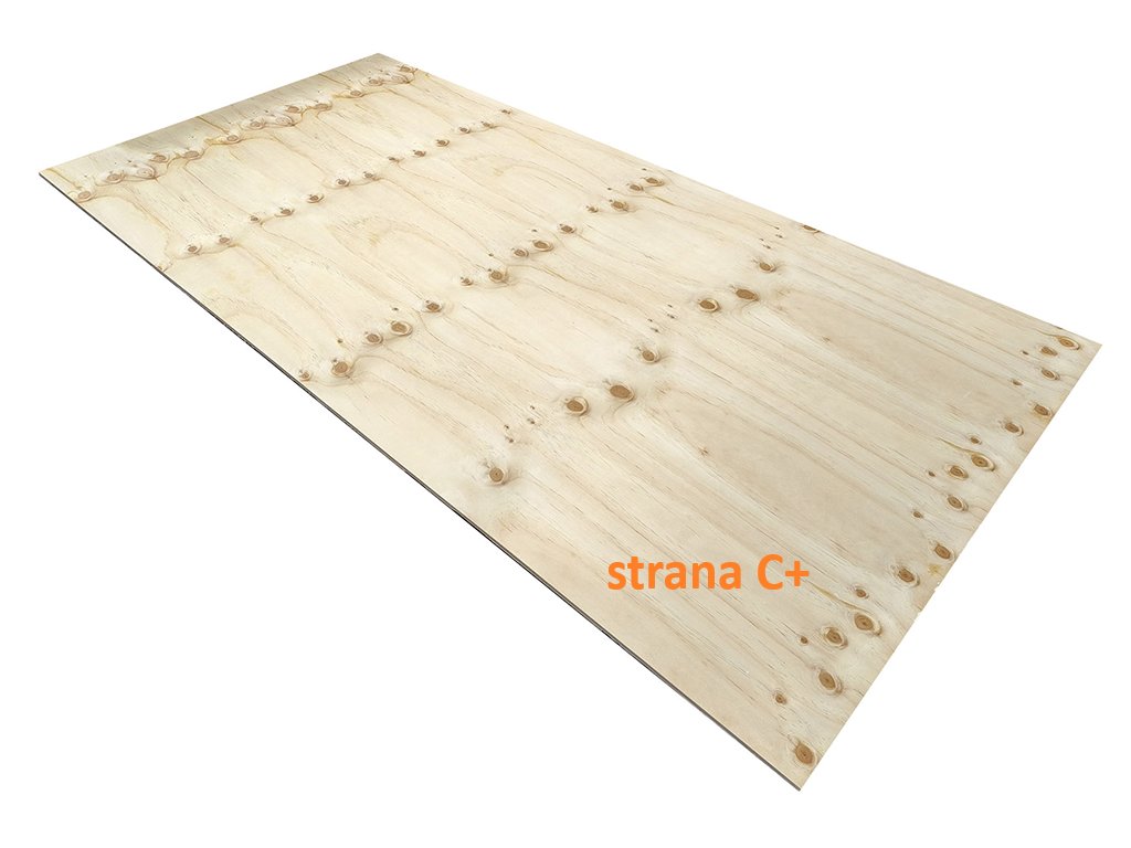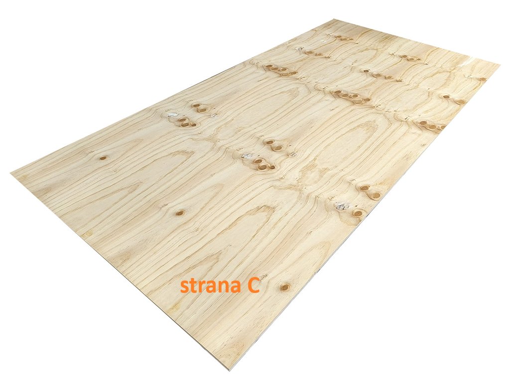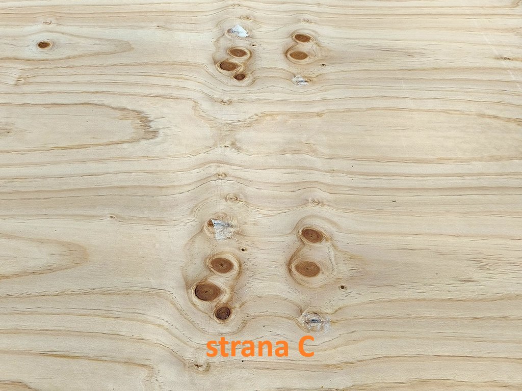 Tyto překližky mají jednu stranu kvality C+ a druhou stranu kvality C (objevují se kytovaná místa).