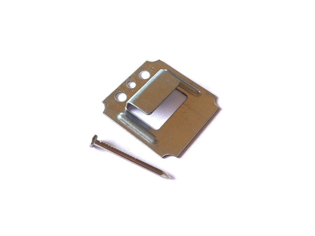 Železná úchytka (klip, sponka) na palubky se hodí jako skrytý prvek pro upevnění dřevěných palubek a PVC panelů.